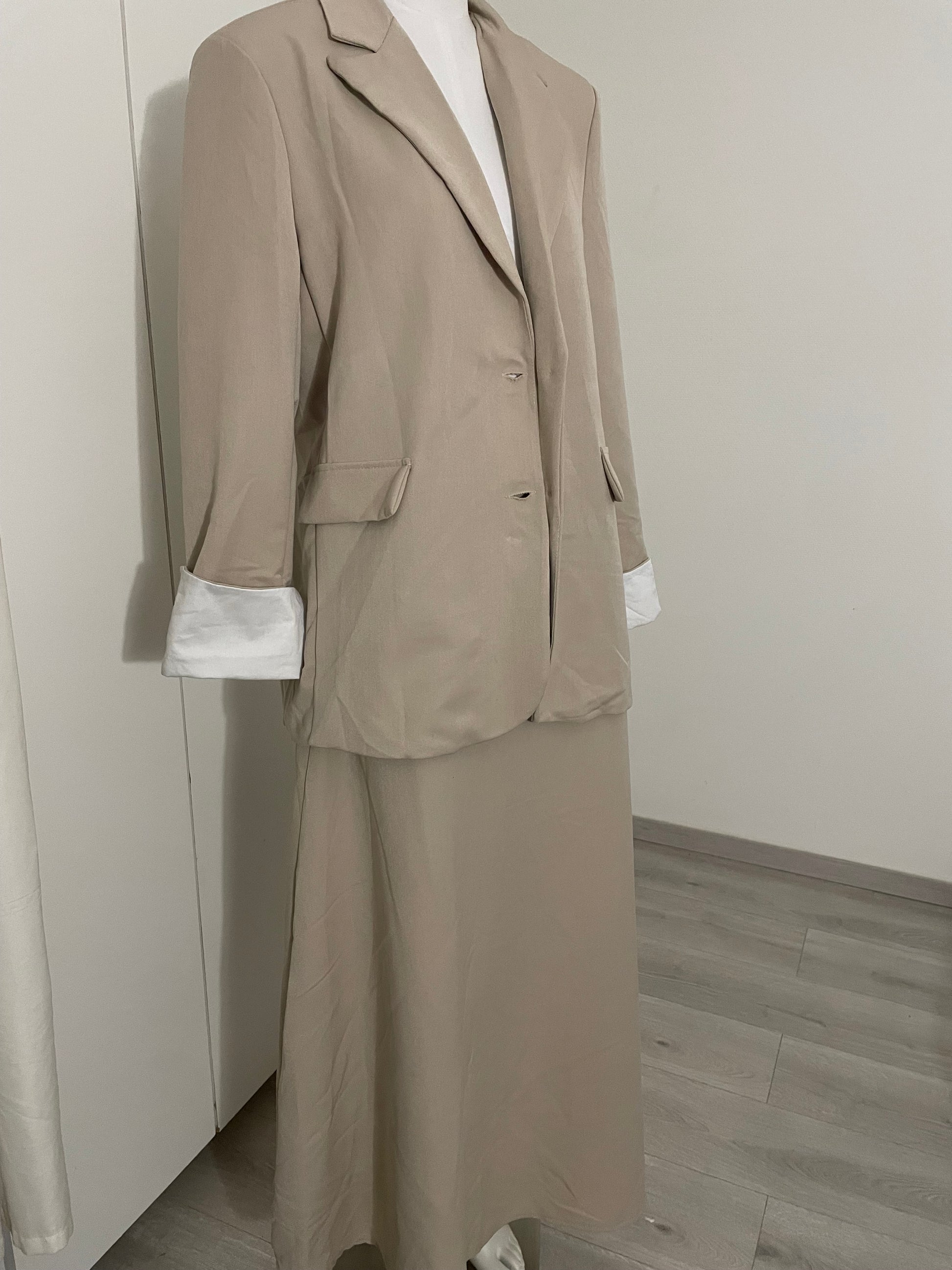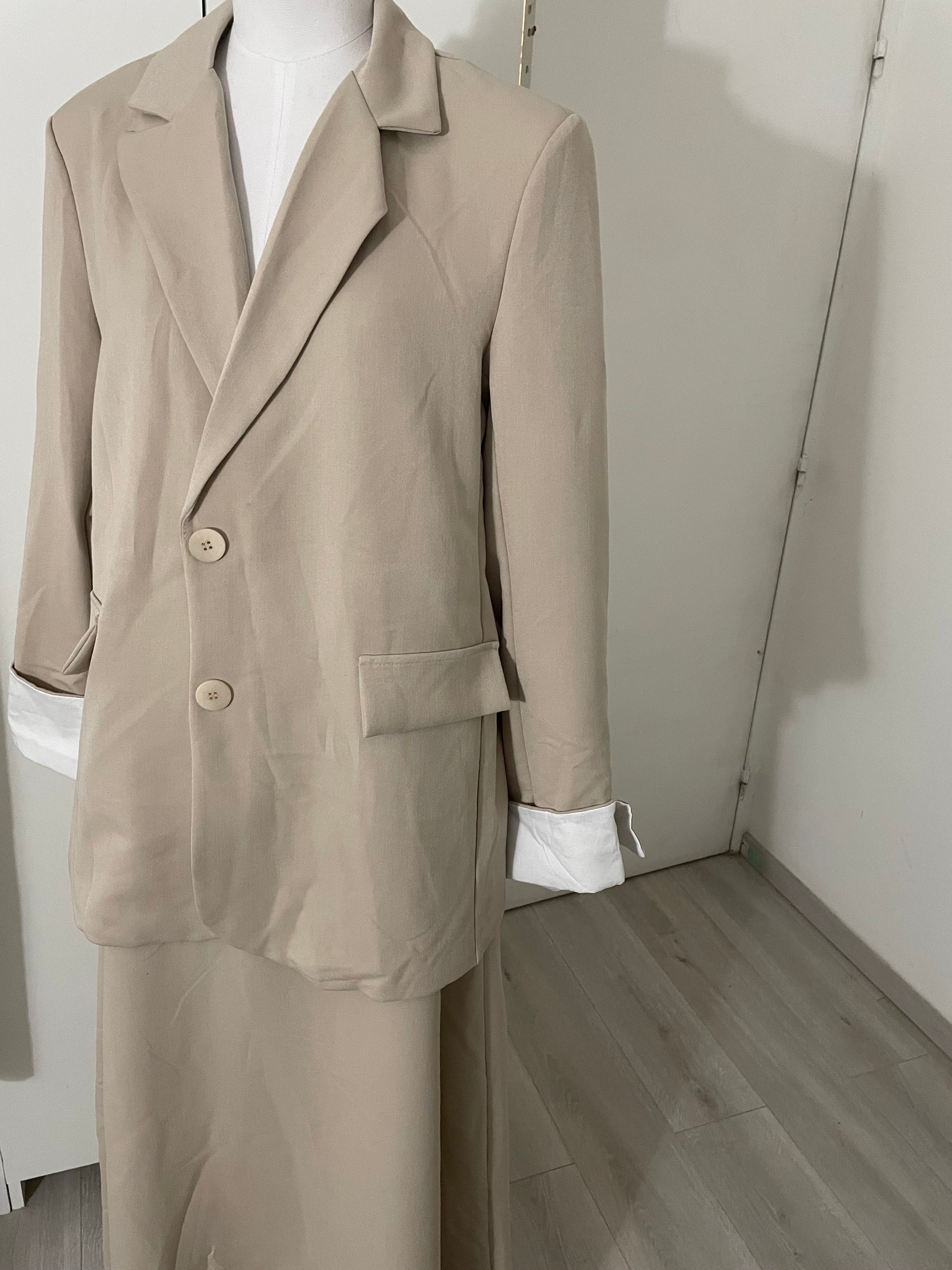 Élégance intemporelle et confort moderne s’unissent dans ce tailleur mastour beige, conçu pour sublimer votre allure tout en préservant votre modestie. Ce deux-pièces d’excellente qualité se distingue par une coupe oversize soigneusement pensée pour offrir une liberté de mouvement optimale tout en restant chic.